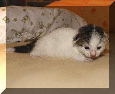 Anton ist der Härtefall des Wurfes... Wenn er mich hört oder sieht, dreht er ab und versucht, aus dem Kindergarten zu hüpfen, egal, wo er dabei durch muss... Und was er für ein Geschrei dabei macht... Vier Wochen ist er jetzt alt.