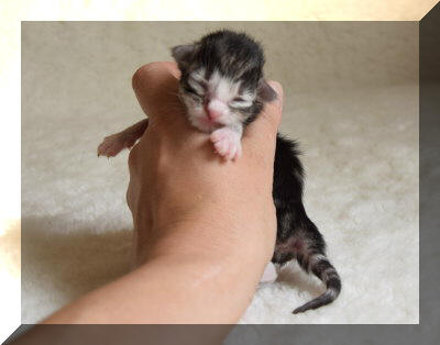 Mit fast zwei Wochen ist Efie die einzige etwas zartere Maus des ganzen Wurfes. Sie ist quietschfidel, sieht aber ein bisschen wie die kleine Schwester aus. Sie hatte mit knapp 100 g auch mit Abstand das geringste Geburtsgewicht. |