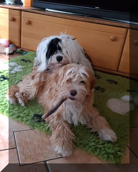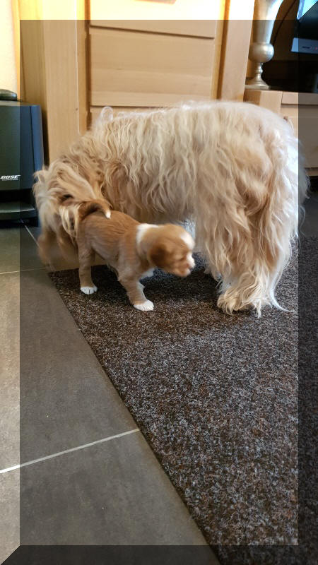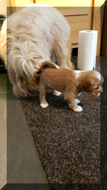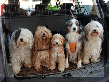 Nun ist definitiv der Kofferraum voll. Aber wir fünf passen gut rein, finde ich. Während der Fahrt komme ich an alle vier dran, um sie zu ärgern... Das ist sowieso meine Lieblingsbeschäftigung. Wie schnell man doch Ja-na auf die Palme bringen kann - und Cooper erst... Witzig.... Dass die sich aber auch immer gleich so aufregen müssen... Haha... Mir macht es Spaß, aber gern' habe ich sie doch.
