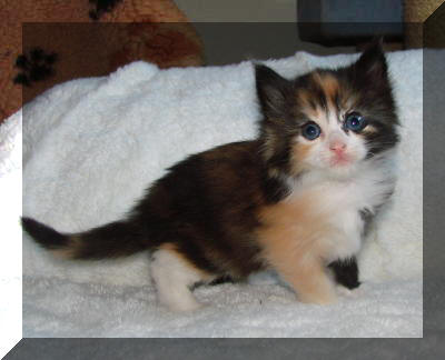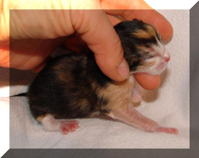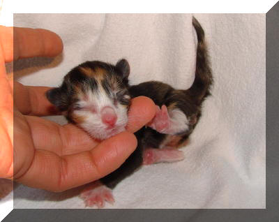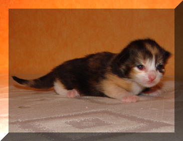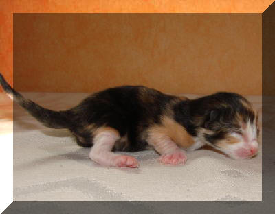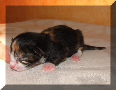 Maja hat eine tolle Farbverteilung. Mit anderthalb Wochen schaut sie schon interessiert in die Welt.
