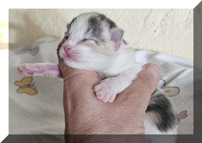 Wilma war mit 89 g die Kleinste des Wurfes, hat aber schon prima aufgeholt. Fünf Tage ist sie jetzt alt. |