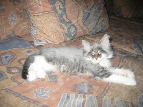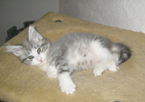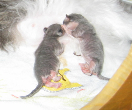 In unserem D-Wurf waren zwei von vier Kitten sichtbar von dem Phänomen "frosted" betroffen. Zu Anfang sah es extrem aus, die zwei Kitten waren vorne normal gefärbt und hinten hell. Da diese Kätzchen aber schon im Alter von 8 Wochen fast normal durchgefärbt sind, hier nur je zwei Bilder, einmal im Alter von zwei Tagen und dann im Alter von knapp 8 Wochen: