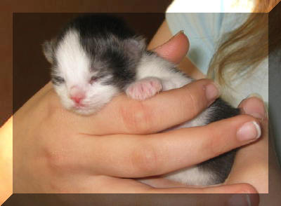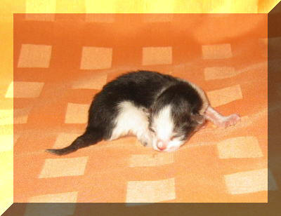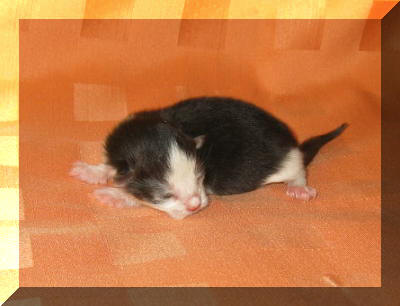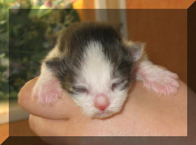 Wieder mal haben wir im Wurf nur eine kleine Prinzessin... Ida hat einen sehr schönen Kopf, ihre Farbe ist noch nicht endgültig, vielleicht kommt doch noch eine Tabbyzeichnung zum Vorschein. Zwei Tage ist die Maus alt.