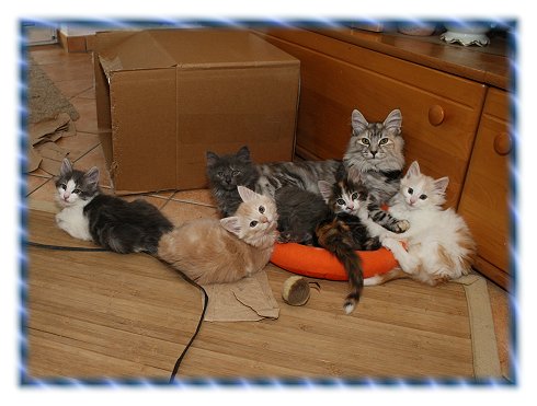 Unsere Babies wachsen sehr menschenbezogen auf. Unsere Katzenmütter sind uns absolut vertraut, so dass wir eigentlich als "Miteltern" gelten. Bei der Geburt verlassen sie sich auf uns, falls es mal Probleme geben sollte und auch danach werden wir Zweibeiner immer mit in die Aufzucht einbezogen. Geboren werden die Kitten normalerweise in unserem Schlafzimmer, in das die Mama - und zwar nur sie - etwa 2 Wochen vor dem geplanten Geburtstermin mit einzieht. Wenn dann die Minitiger mit etwa 3 Wochen etwas mehr von der Welt sehen möchten, ziehen sie in den etwa 2 x 1 m großen "Kindergarten" in unserem Wohnzimmer um, in dem sie die ersten Begegnungen mit festem Futter, dem Katzenklo und allen Mitkatzen machen. Wenn sie dann mit etwa 5 Wochen wieder einen riesengroßen Entwicklungsschritt getan haben, wird ihre Welt auf unser Wohnzimmer vergrößert, das auf ca. 80 cm Höhe vom Rest des Hauses zunächst abgetrennt bleibt, aber doch mitten im Geschehen liegt. In dieser Zeit schon werden die Zwerge auf alles geprägt, was sie für ihr weiteres Leben benötigen. Mit etwa 8 Wochen steht ihnen das ganze Haus zur Verfügung und sie lernen viel von den Großen, auch Gefahren einzuschätzen, beispielsweise bei Treppen und hohen Kratzbäumen. Wenn sie dann mit etwa 12 - 14 Wochen in ihre neuen Familien umziehen sind sie in der Lage, sich gegen Hunde durchzusetzen und einer Horde Kinder zu zeigen, wo's lang geht. Sofern es entfernungsmäßig möglich ist, begleiten wir sie in ihr neues Zuhause, damit wir uns davon überzeugen können, dass unsere mit Liebe aufgezogenen Zwerge zu richtig netten neuen Pflegeeltern kommen. Diese erhalten von uns alle Informationen, die sie für ihr zukünftiges neues Familienmitglied brauchen. Auch nachher stehen wir mit Rat und Tat zur Seite. Das Anfangsleben vor dem Umzug wird reichlich in Bildern festgehalten, so dass die künftigen Besitzer sich auch die erste Zeit "ihres" Babies immer wieder ansehen können.