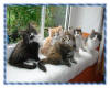 Unsere Babies wachsen sehr menschenbezogen auf. Unsere Katzenmütter sind uns absolut vertraut, so dass wir eigentlich als "Miteltern" gelten. Bei der Geburt verlassen sie sich auf uns, falls es mal Probleme geben sollte und auch danach werden wir Zweibeiner immer mit in die Aufzucht einbezogen. Geboren werden die Kitten normalerweise in unserem Schlafzimmer, in das die Mama - und zwar nur sie - etwa 2 Wochen vor dem geplanten Geburtstermin mit einzieht. Wenn dann die Minitiger mit etwa 3 Wochen etwas mehr von der Welt sehen möchten, ziehen sie in den etwa 2 x 1 m großen "Kindergarten" in unserem Wohnzimmer um, in dem sie die ersten Begegnungen mit festem Futter, dem Katzenklo und allen Mitkatzen machen. Wenn sie dann mit etwa 5 Wochen wieder einen riesengroßen Entwicklungsschritt getan haben, wird ihre Welt auf unser Wohnzimmer vergrößert, das auf ca. 80 cm Höhe vom Rest des Hauses zunächst abgetrennt bleibt, aber doch mitten im Geschehen liegt. In dieser Zeit schon werden die Zwerge auf alles geprägt, was sie für ihr weiteres Leben benötigen. Mit etwa 8 Wochen steht ihnen das ganze Haus zur Verfügung und sie lernen viel von den Großen, auch Gefahren einzuschätzen, beispielsweise bei Treppen und hohen Kratzbäumen. Wenn sie dann mit etwa 12 - 14 Wochen in ihre neuen Familien umziehen sind sie in der Lage, sich gegen Hunde durchzusetzen und einer Horde Kinder zu zeigen, wo's lang geht. Wir werden sie in ihr neues Zuhause begleiten, damit wir uns davon überzeugen können, dass unsere mit Liebe aufgezogenen Zwerge zu richtig netten neuen Pflegeeltern kommen. Diese erhalten von uns alle Informationen, die sie für ihr zukünftiges neues Familienmitglied brauchen. Auch nachher stehen wir mit Rat und Tat zur Seite. Das Anfangsleben vor dem Umzug wird reichlich in Bildern festgehalten, so dass die künftigen Besitzer sich auch die erste Zeit "ihres" Babies immer wieder ansehen können.