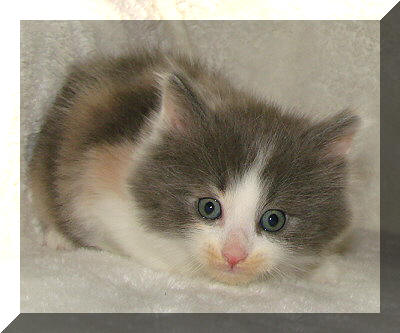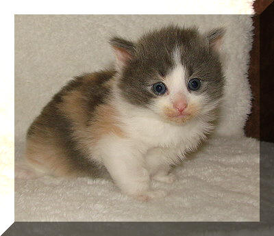 Auch mit fünfeinhalb Wochen hat Tine noch ihr oranges Schnütchen. Aber ob sie evtl. doch tabby hat, sieht man noch nicht richtig.